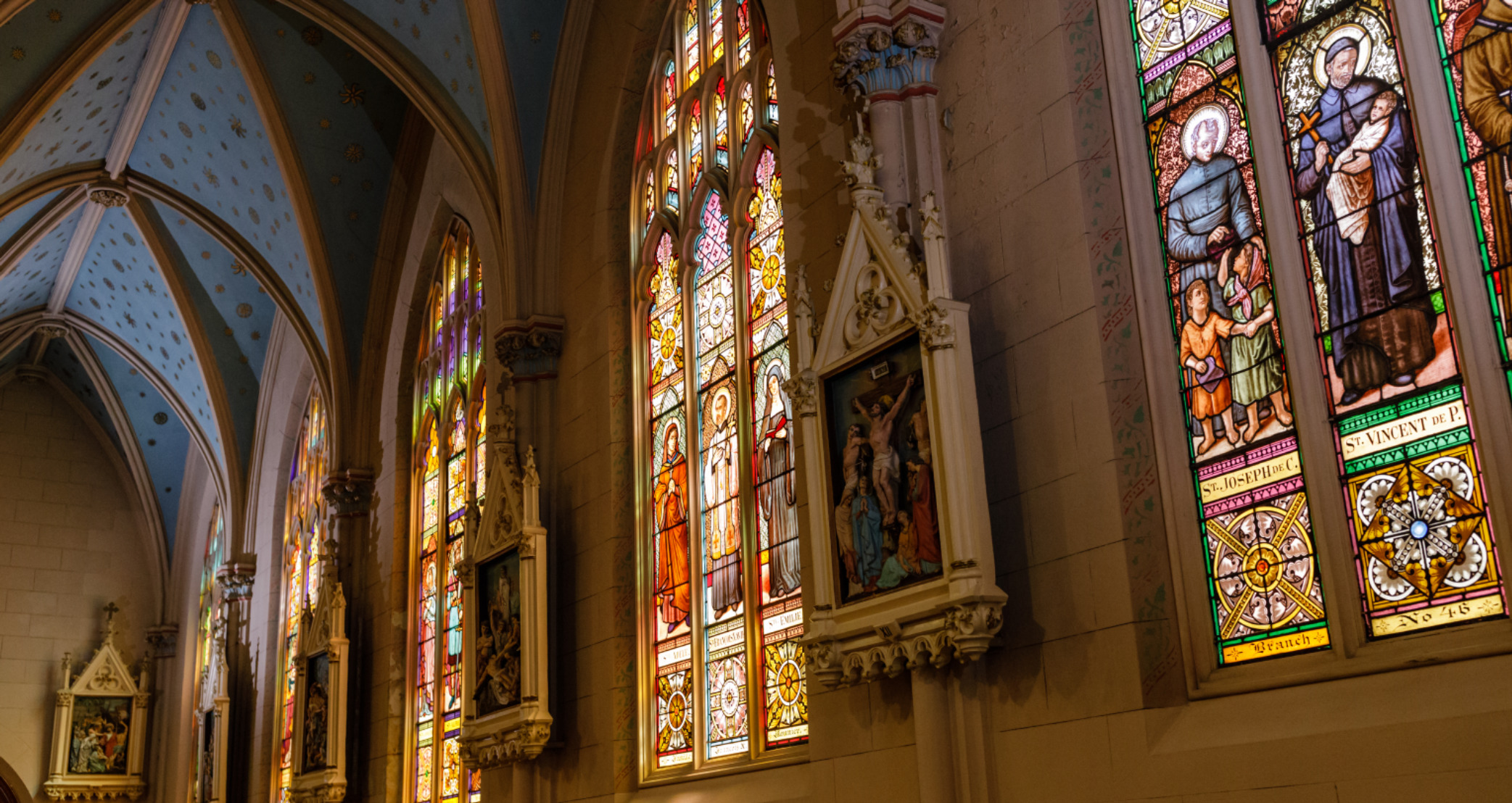 It contains several elements of previous structures, including the 1818 altar and stained glass windows.